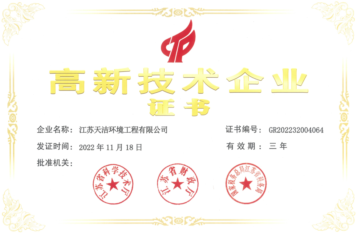 江蘇天潔環(huán)境工程有限公司高新技術(shù)企業(yè)證書
